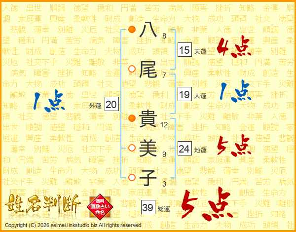 八尾貴美子さんの総運は39画の5点!