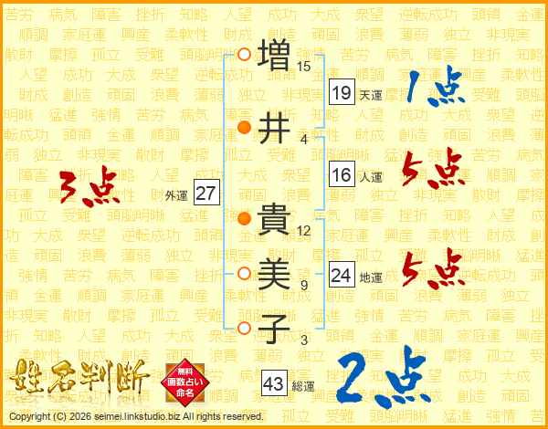 増(15画)井(4画) 貴(12画)美(9画)子(3画)