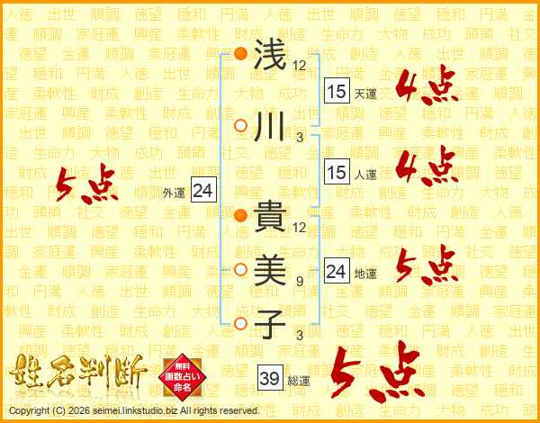 浅(12画)川(3画) 貴(12画)美(9画)子(3画)