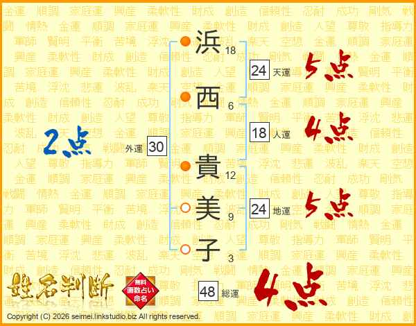 浜(18画)西(6画) 貴(12画)美(9画)子(3画)