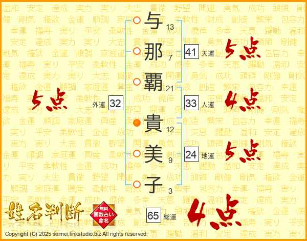 与(13画)那(7画)覇(21画) 貴(12画)美(9画)子(3画)