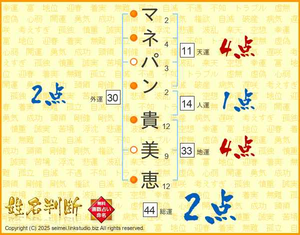 マ(2画)ネ(4画)パ(3画)ン(2画) 貴(12画)美(9画)恵(12画)