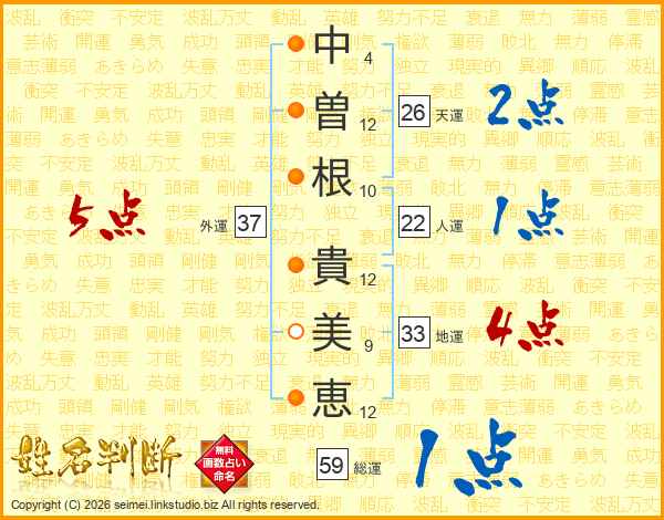 中曽根貴美恵さんの外運は37画の5点!