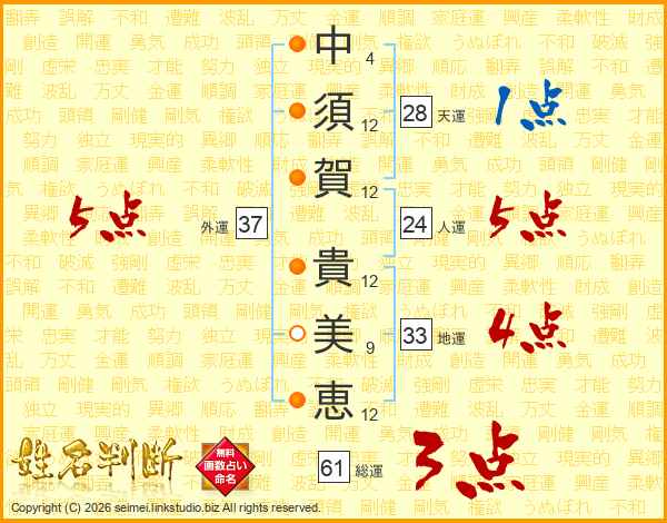 中(4画)須(12画)賀(12画) 貴(12画)美(9画)恵(12画)