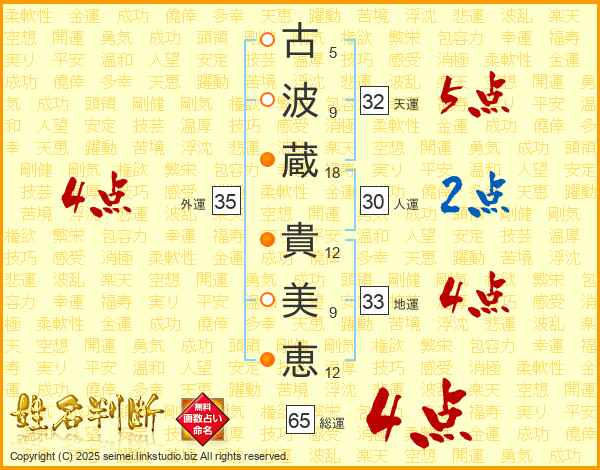 古(5画)波(9画)蔵(18画) 貴(12画)美(9画)恵(12画)