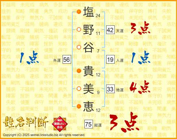 塩(24画)野(11画)谷(7画) 貴(12画)美(9画)恵(12画)