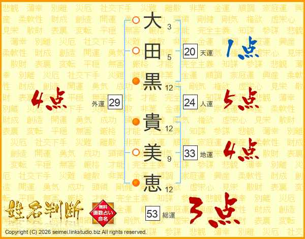 大(3画)田(5画)黒(12画) 貴(12画)美(9画)恵(12画)
