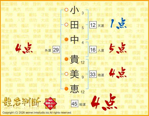 小(3画)田(5画)中(4画) 貴(12画)美(9画)恵(12画)