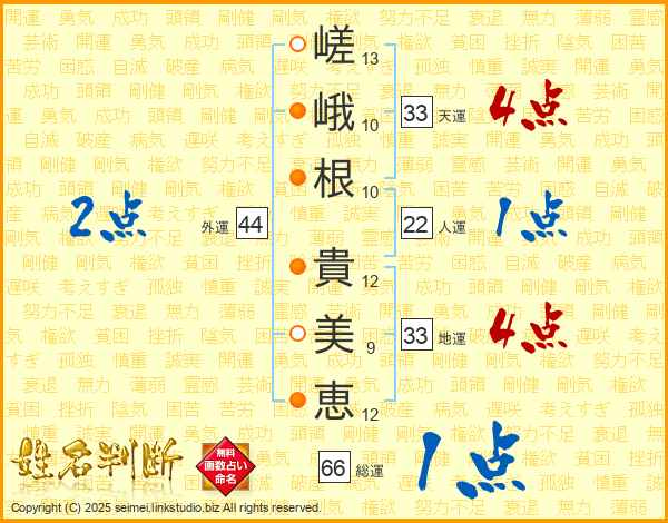 嵯(13画)峨(10画)根(10画) 貴(12画)美(9画)恵(12画)