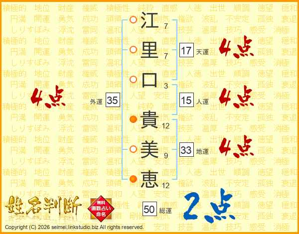 江(7画)里(7画)口(3画) 貴(12画)美(9画)恵(12画)