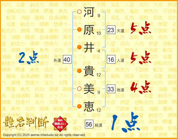 河(9画)原(10画)井(4画) 貴(12画)美(9画)恵(12画)