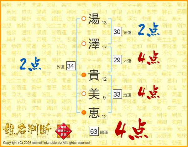 湯(13画)澤(17画) 貴(12画)美(9画)恵(12画)