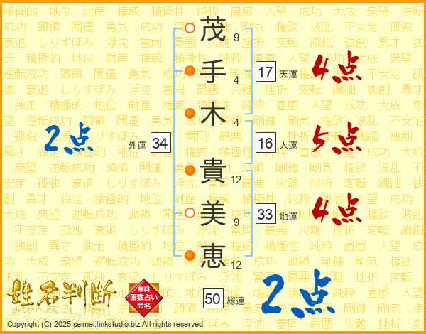 茂(9画)手(4画)木(4画) 貴(12画)美(9画)恵(12画)