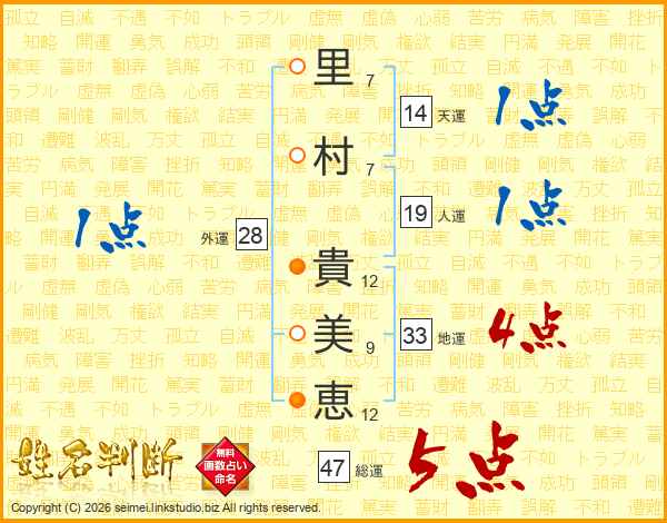 里(7画)村(7画) 貴(12画)美(9画)恵(12画)