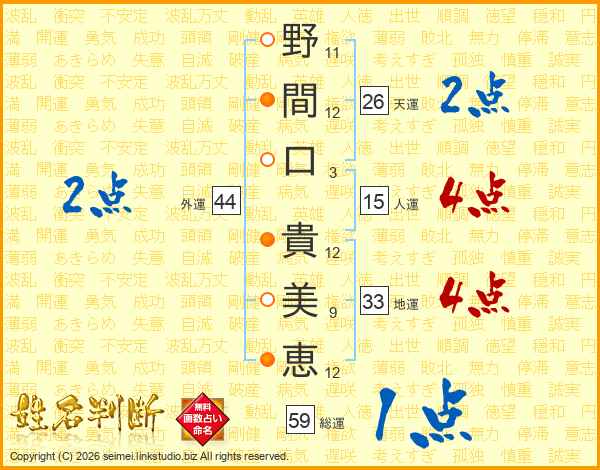 野(11画)間(12画)口(3画) 貴(12画)美(9画)恵(12画)