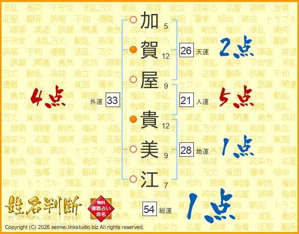 加(5画)賀(12画)屋(9画) 貴(12画)美(9画)江(7画)
