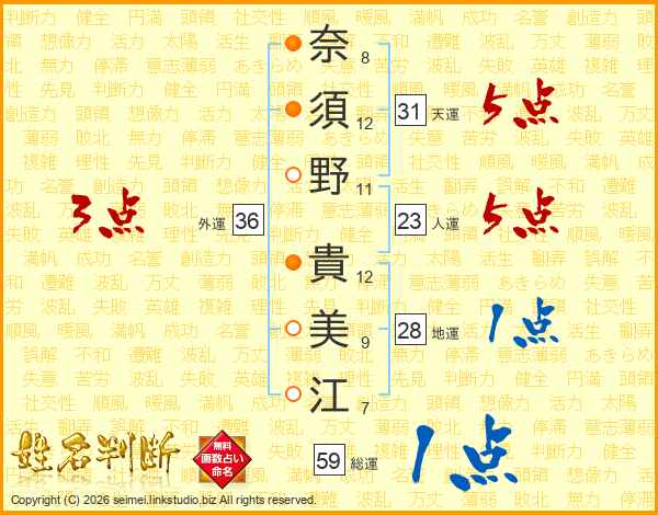 奈(8画)須(12画)野(11画) 貴(12画)美(9画)江(7画)