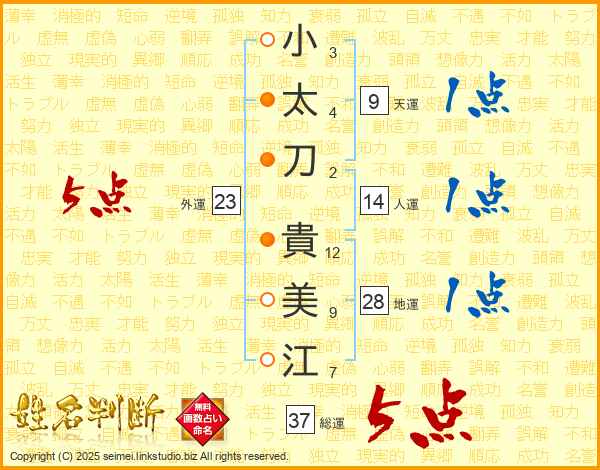 小(3画)太(4画)刀(2画) 貴(12画)美(9画)江(7画)