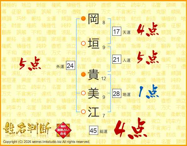 岡(8画)垣(9画) 貴(12画)美(9画)江(7画)