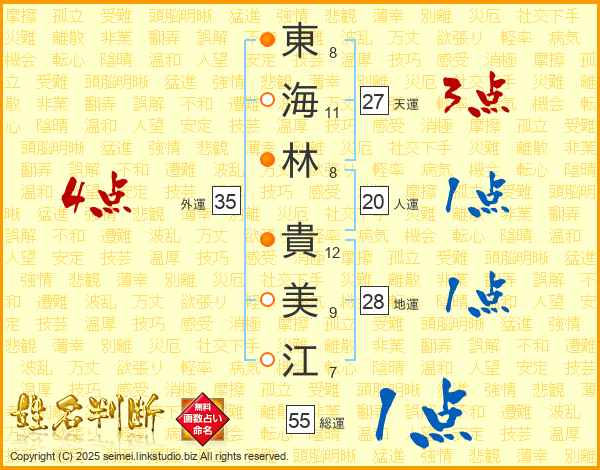東(8画)海(11画)林(8画) 貴(12画)美(9画)江(7画)