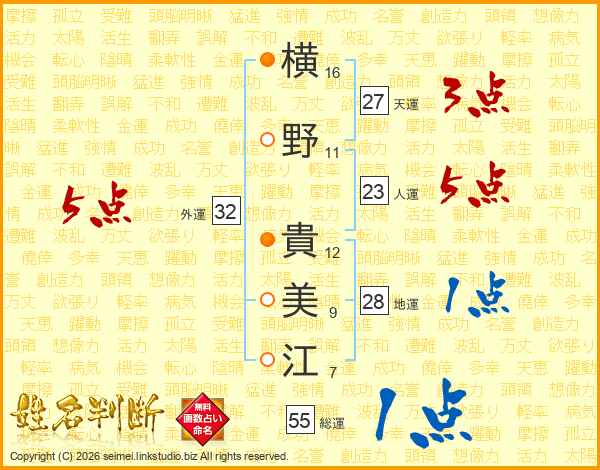 横(16画)野(11画) 貴(12画)美(9画)江(7画)