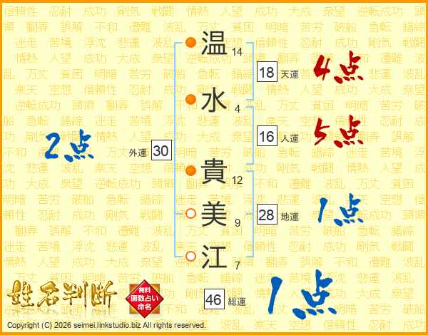 温(14画)水(4画) 貴(12画)美(9画)江(7画)