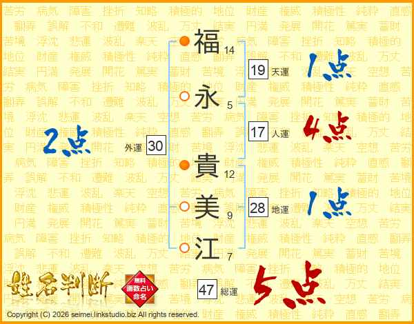 福(14画)永(5画) 貴(12画)美(9画)江(7画)