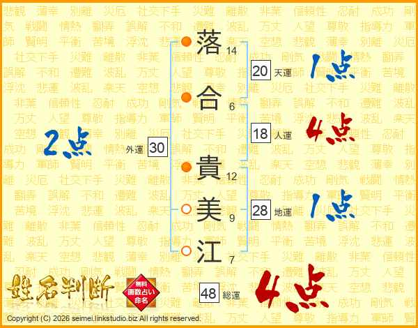 落(14画)合(6画) 貴(12画)美(9画)江(7画)