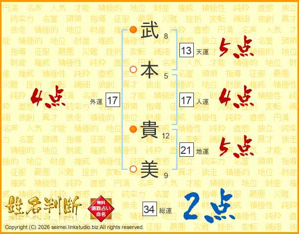 武(8画)本(5画) 貴(12画)美(9画)