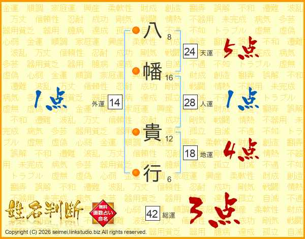 生活面を象徴する運勢です。外部から受ける影響力を表し、結婚運、家庭運や職場、環境への順応性を表します。総運から人運を引いた画数。姓や名が1文字の場合を除く。