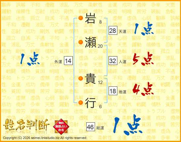 岩(8画)瀬(20画) 貴(12画)行(6画)