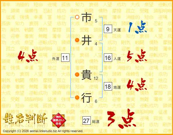 あなたの人生を表す1番重要な運勢です。生涯を通じて影響する総合運となり、主に50歳以降の晩年期に影響を及ぼします。苗字と名前の合計画数。