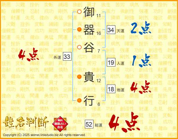 御(11画)器(16画)谷(7画) 貴(12画)行(6画)