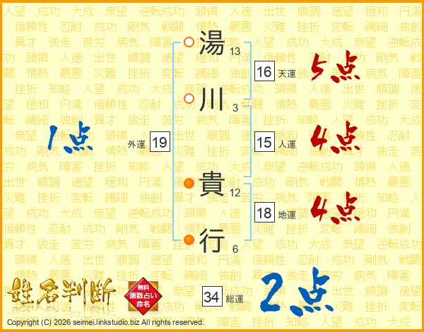 あなたの人生を表す1番重要な運勢です。生涯を通じて影響する総合運となり、主に50歳以降の晩年期に影響を及ぼします。苗字と名前の合計画数。
