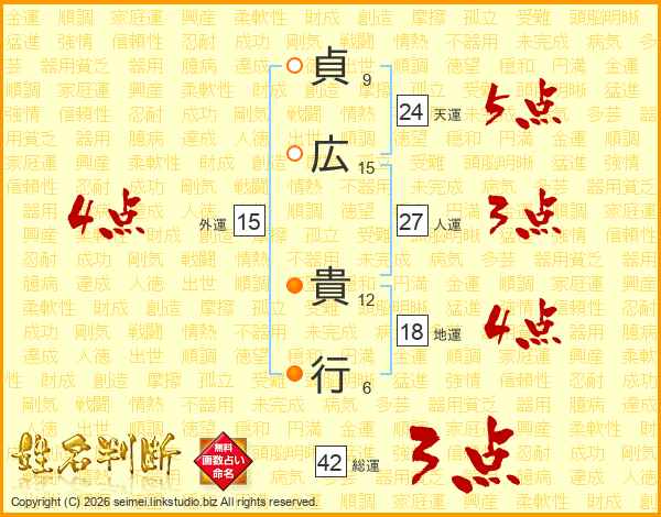 貞(9画)広(15画) 貴(12画)行(6画)