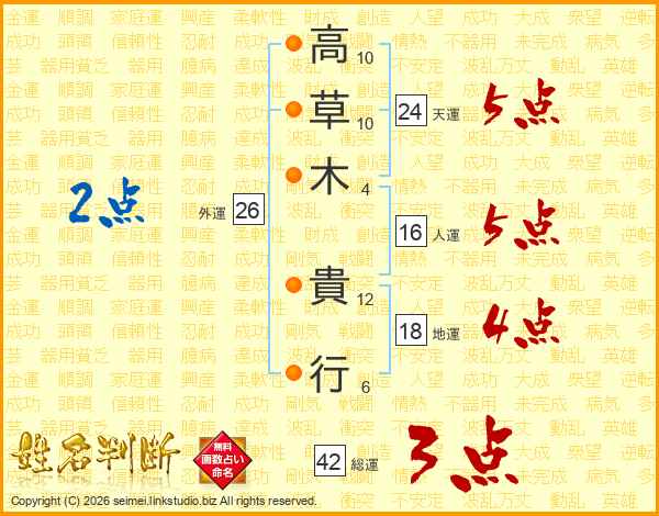 高(10画)草(10画)木(4画) 貴(12画)行(6画)