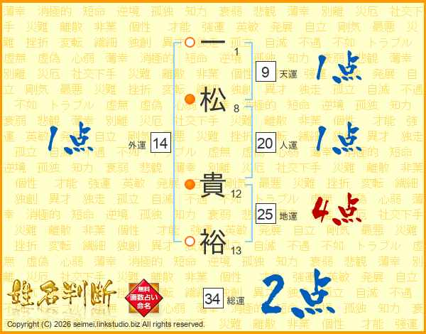 あなたの人生を表す1番重要な運勢です。生涯を通じて影響する総合運となり、主に50歳以降の晩年期に影響を及ぼします。苗字と名前の合計画数。