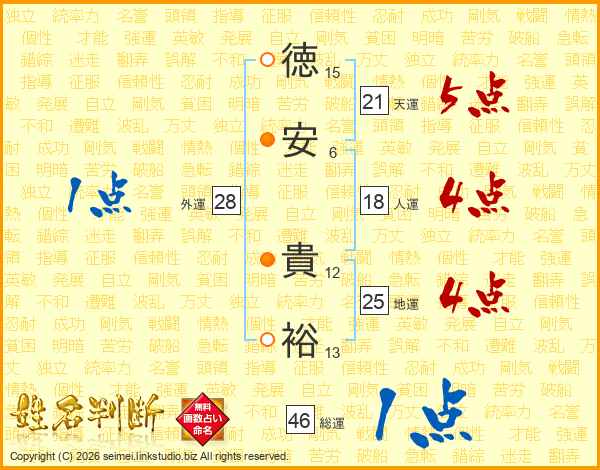 徳(15画)安(6画) 貴(12画)裕(13画)