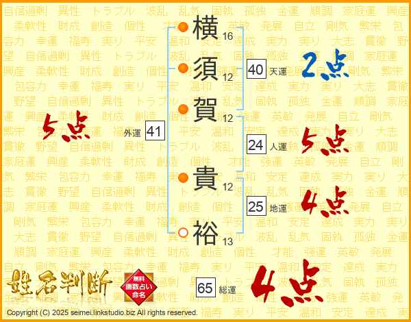 横(16画)須(12画)賀(12画) 貴(12画)裕(13画)