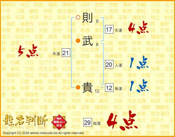 生活面を象徴する運勢です。外部から受ける影響力を表し、結婚運、家庭運や職場、環境への順応性を表します。総運から人運を引いた画数。姓や名が1文字の場合を除く。