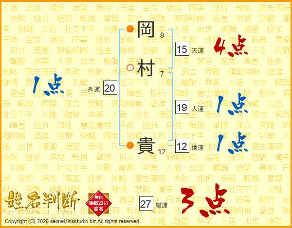 あなたの人生を表す1番重要な運勢です。生涯を通じて影響する総合運となり、主に50歳以降の晩年期に影響を及ぼします。苗字と名前の合計画数。