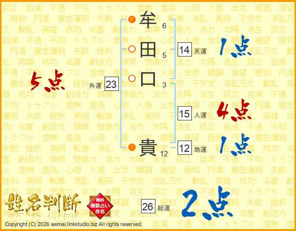 牟(6画)田(5画)口(3画) 貴(12画)