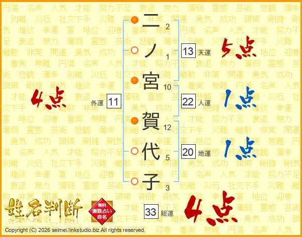 生活面を象徴する運勢です。外部から受ける影響力を表し、結婚運、家庭運や職場、環境への順応性を表します。総運から人運を引いた画数。姓や名が1文字の場合を除く。
