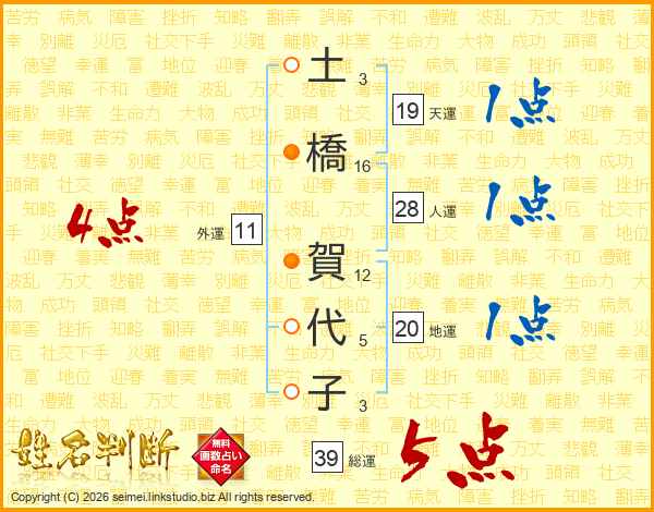 土(3画)橋(16画) 賀(12画)代(5画)子(3画)