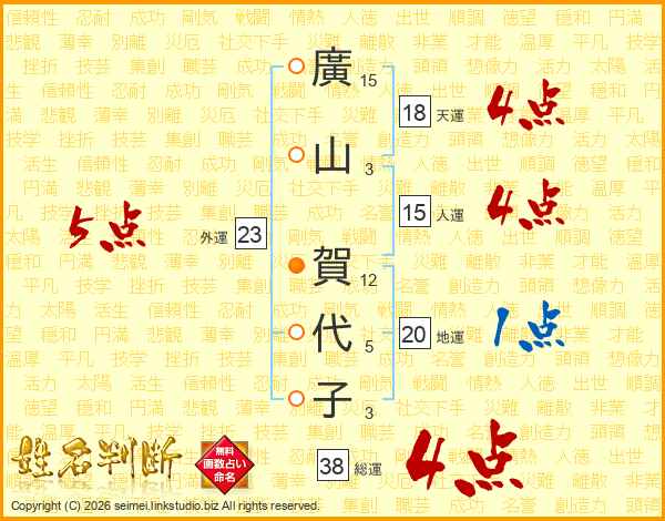 廣(15画)山(3画) 賀(12画)代(5画)子(3画)