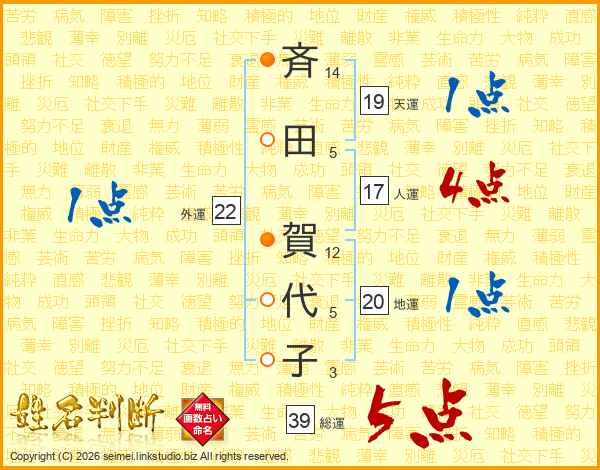 斉(14画)田(5画) 賀(12画)代(5画)子(3画)