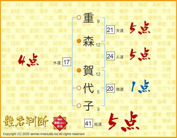 重(9画)森(12画) 賀(12画)代(5画)子(3画)
