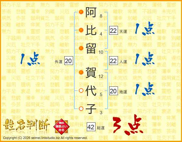 阿(8画)比(4画)留(10画) 賀(12画)代(5画)子(3画)