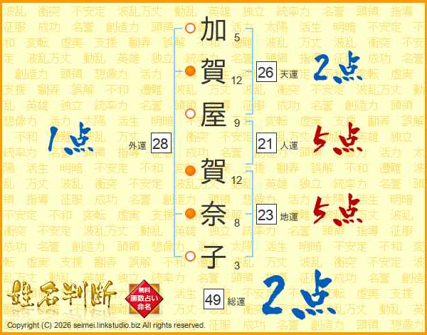 加(5画)賀(12画)屋(9画) 賀(12画)奈(8画)子(3画)