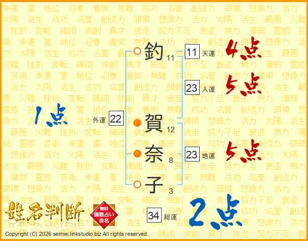 釣(11画) 賀(12画)奈(8画)子(3画)